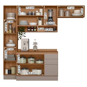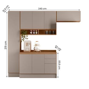 Modelo: Cozinha Acacia 7 Portas e 3 Gavetas; Material da estrutura: MDP em 12 mm e 15 mm; Dimensões: 240 cm(L) x 219 cm(A) x 51,5 cm(P) Profundidade inferior: 51,5 cm; Profundidade superior: 31,4 cm; Quantidade de portas: 07 (dobradiças metálicas com fecho toque); Quantidade de gaveta: 03 sendo (corrediças metálicas); Medidas internas da gaveta: 32 cm(L) x 38,5 cm(P) x 10 cm(A); Com puxador: Não se aplica; Quantidade prateleiras: 6; Pés com regulagem: Sim, de plásticos com rodapé; Peso suportado: até 85 kg distribuídos; Requer montagem: Sim (kit montagem incluso).
