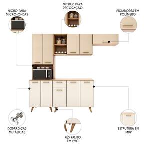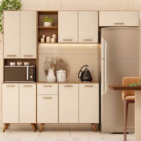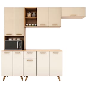 O Paneleiro conta com quatro portas que garantem muito mais organização no dia a dia, além de um nicho para micro-ondas ou forno elétrico. Enquanto o Balcão vem com três portas e duas gavetas. Os pés palitos em PVC, trazem um visual retrô e ainda são reguláveis, o que permite ajustar pequenos desníveis de piso e manter a estabilidade do produto.