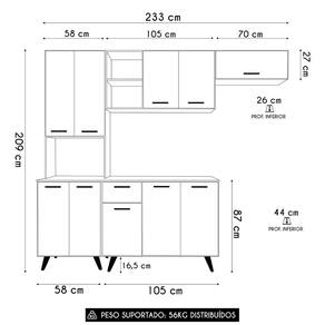 O Armário Aéreo dispõe de duas portas e dois nichos na lateral, perfeitos para expor objetos decorativos, temperos e itens de sua preferência, mantendo tudo sempre ao alcance das mãos com acesso facilitado. Já o Armário de Geladeira completa a composição com uma porta basculante com pistão a gás, proporcionando um movimento suave e .