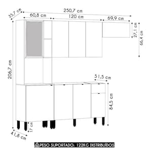 O Armário Aéreo possui três portas convencionais, enquanto o armário de geladeira apresenta uma porta basculante, todas passantes, dispensando o uso de puxadores o que dá à composição um estilo contemporâneo. O Balcão Para Pia vem com três portas convencionais com puxadores em alumínio e uma gaveta. A Pia inox tem um design funcional, com excelente desempenho no escoamento da água e possibilita o uso de diferentes objetos sobre ela.