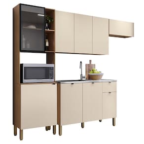 O Armário Aéreo possui três portas convencionais, enquanto o armário de geladeira apresenta uma porta basculante, todas passantes, dispensando o uso de puxadores o que dá à composição um estilo contemporâneo. O Balcão Para Pia vem com três portas convencionais com puxadores em alumínio e uma gaveta. A Pia inox tem um design funcional, com excelente desempenho no escoamento da água e possibilita o uso de diferentes objetos sobre ela.