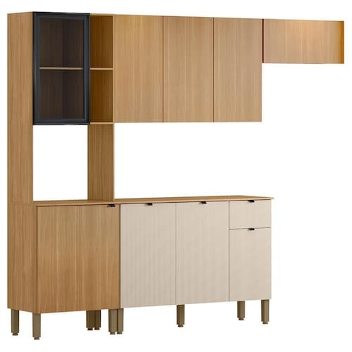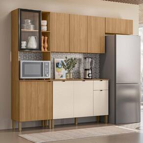 Este Armário de Cozinha é composto por quatro peças perfeitamente distribuídas para atender a todas as suas necessidades. O Paneleiro conta com uma porta inferior com puxador em alumínio e uma porta superior passante, de vidro incolor com borda em ABS, que se destaca no ambiente. Inclui também um nicho para micro-ondas ou forno elétrico e dois nichos laterais para exibir objetos decorativos.