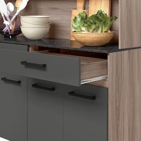 ESPECIFICAÇÕES: Estrutura em MDP Pintura UV 6 Portas em MDP 2 Portas com vidro reflecta Dobradiças metálicas 2 Gavetas Corrediças metálicas Puxadores em ABS Tampo MDP na cor onix
