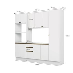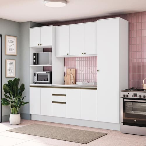Prático e compacto, o combo CB1300 da Cozinha Celeste da Kappesberg é a opção perfeita para quem busca otimizar espaço sem deixar de lado a organização. Com quatro peças, ele conta com as divisórias perfeitas, e produzido em MDF de 15mm, ele garante robustez, firmeza e qualidade, além de um acabamento perfeito, encaixando perfeitamente em todos os ambientes. Com até sete camadas de pintura, seu acabamento brilho na cor branca garante luminosidade e elegância ao espaço, sendo ideal para cozinhas, além da facilidade na limpeza. Com módulo para eletrodomésticos, o kit forno e microondas possui prateleiras reforçadas em 25mm, garantindo o máximo de segurança. Medindo 2,30m de altura e 2,40m de largura, é uma ótima opção para quem possui pouco espaço e não abre mão de versatilidade no dia a dia. E para um melhor acabamento, o combo possui pés, mas acompanha as ferragens para ser montado suspenso na parede, deixando sua cozinha do seu jeito. Os diferenciais ficam por conta das dobradiças com amortecimento, garantindo um fechamento suave e sem ruídos, das corrediças telescópicas e os puxadores na cor dourada, com modelos diferentes no balcão e aéreos, completando o estilo e a qualidade do produto. Viva momentos especiais e renove seu espaço com a Cozinha Celeste da Kappesberg.