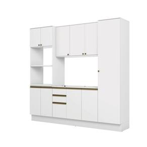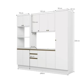 Acabamento: Pintura Brilho | Cor: Branco | Corrediças: Telescópicas | Dobradiça: Com Amortecimento | Garantia: 3 meses para defeito de fabricação | Matéria-prima: MDF | Peso suportado por cada gaveta: 6 Kg | Peso suportado por cada prateleira: 7 kg | Puxadores: Metálicos / Puxadores de Metal e de Alumínio | Quantidade de gavetas: 3 | Quantidade de portas: 1 / 3 | Quantidade de prateleiras: 1 / 2 / 4 / 5 | Sistema de montagem: Parafuso Philips | Tipo de porta: Bater | Tipo de móveis de cozinha: Cozinha completa | Duração da Garantia: 3 meses | Montagem: Necessita montagem | Tipo de Garantia: Garantia do fabricante