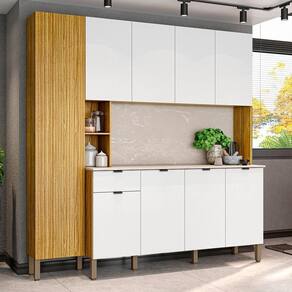 Com um design compacto e muito funcional, esse armário kit de cozinha é perfeito para otimizar o espaço do seu ambiente, de modo a deixar a sua cozinha mais prática e organizada, já que conta com excelente repartição interna, com diversas prateleiras para acomodar todas as suas panelas, louças, eletros e demais itens de cozinha. Já o charme fica por conta da porta do paneleiro, que além de ser em MDF, ainda possui detalhe riscatto na cor freijó e abertura com fecho magnético, garantindo praticidade e . Para completar, as dobradiças com amortecedores e corrediças telescópicas proporcionam um fechamento suave e silencioso, resultando em um armário duradouro e resistente.