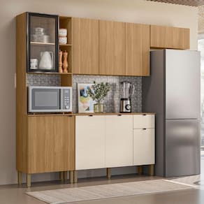 O Armário Aéreo possui três portas convencionais, enquanto o Armário de Geladeira apresenta uma porta basculante, todas passantes, dispensando o uso de puxadores, o que dá à composição um visual contemporâneo. O Balcão vem com três portas convencionais com puxadores em alumínio e uma gaveta. Além disso, o tampo serve como apoio para eletrodomésticos, proporcionando um acabamento impecável.