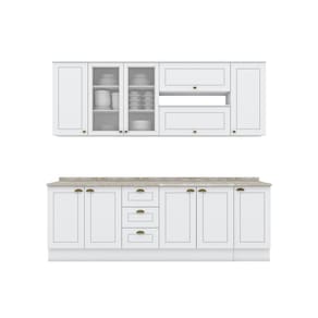 Composicao do Kit -AxLxP-: 1 Aereo 03 Portas 83 x 120 x 32,5 Cm; 2 Aereo 01 Porta Basc. 34 x 80 x 32,5 Cm; 1 Aereo 01 Porta 83 x 40 x 32,5 Cm; 1 Balcao Pia 02 Portas e 03 Gavetas 82 x 120 x 51 Cm; 1 Balcao 02 Portas 82 x 80 x 51 Cm; 1 Balcao 01 Porta 82 x 40 x 51 Cm; 1 Tampo 2,5 x 120 x 53,5 Cm; 1 Tampo 2,5 x 80 x 53,5 Cm; 1 Tampo 2,5 x 40 x 53,5 Cm;
