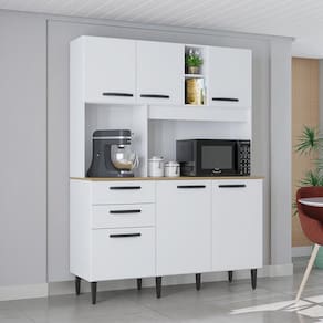 Maxima Organizacao em um Design Inteligente: A Cozinha Flavia foi projetada para otimizar cada centimetro do seu espaco com muita inteligencia: 06 Portas Amplas: O grande numero de portas oferece compartimentos espacosos, ideais para guardar loucas, panelas, e mantimentos de forma organizada e protegida. 02 Gavetas Funcionais: Equipadas com corredicas metalicas, as gavetas deslizam suavemente, perfeitas para armazenar talheres, utensilios menores e panos de prato. Pes com Regulagem: Os Pes de Plastico com Regulagem permitem o ajuste de altura conforme a irregularidade do piso, garantindo que o movel fique perfeitamente nivelado e estavel.