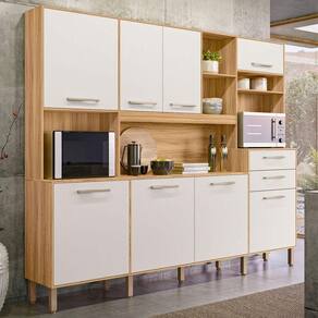 Caracteristicas principais: Estrutura em MDP com espessura de 12 mm 8 Portas (bater e basculantes) e 2 Gavetas com corredicas telescopicas 5 prateleiras internas com capacidade de ate 8 kg cada Espaco dedicado para micro-ondas e forno (50,1 x 59 x 44,8 cm) Pes com regulagem de altura para maior estabilidade Acompanha tampo e puxadores em plastico resistente Sistema de montagem por parafusos, cavilhas e minifix Acabamento Freijo/Off White Cristal que combina com diversos estilos de decoracao Grau de dificuldade: Medio - acompanha manual detalhado. Recomendacao: pode ser montado pelo proprio cliente com atencao as instrucoes. Nao inclui servico de montagem. Para limpeza, utilize pano seco ou levemente umedecido. Evite produtos abrasivos.