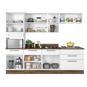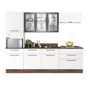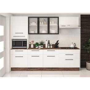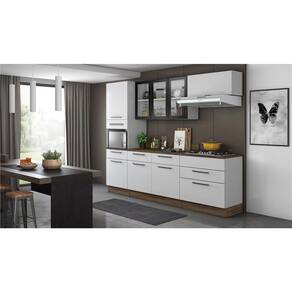 Os móveis também possuem puxadores em alumínio com ponteira em ABS Cromado que inserem um visual impecável, e os módulos de chão possuem rodapés em polímero resistente a água que ocultam os pés plásticos, possibilitando que a limpeza seja prática, sem abrir mão da sofisticação estética.