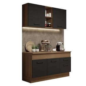 O acabamento da estrutura é em amadeirado Rustic e o das portas e frentes é preto. As partes internas das costas e das gavetas são brancas. O processo é feito em Pintura Poliéster com 7 camadas de proteção resistentes a álcool, água e calor.