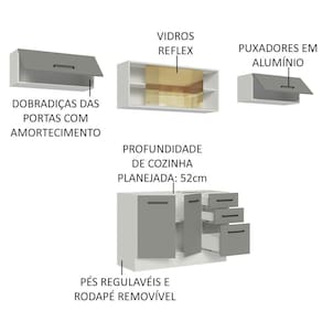 Todas as portas contam com puxador com alça de alumínio e dobradiças com amortecimento. As gavetas possuem corrediça telescópica de abertura total.