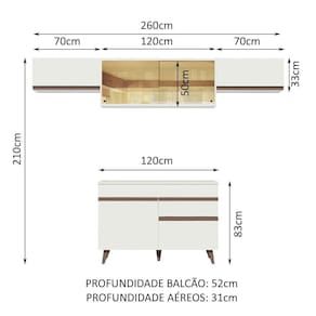 As medidas totais são: 260 cm de largura e profundidade de 52 cm no balcão e 31 cm nos aéreos. A altura sugerida com base na linha é de 210 cm.