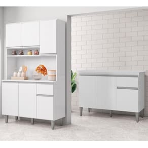 O Kit de Cozinha pode ser montado de acordo com a sua necessidade, pois o balcão pode ser instalado na mesma parede ou separados. A Cozinha Compacta tem um ótimo acabamento, e combina com qualquer decoração. O balcão de 120cm possui tampo e tem 5 pés niveladores. Já o armário tem um nicho menor para condimentos ou decorações e outro maior para eletroportáteis e outros itens, e seis portas para mantimentos, panelas ou potes. A Cozinha é feita de MDP de alta qualidade e tem puxadores em PVC. As portas e gavetas têm dobradiças e corrediças metálicas, que garantem uma abertura e fechamento suaves. Ah! E este modelo acompanha tampo para apoio de refeições e outros utensílios. A cozinha tem um estilo moderno e um design funcional, que otimiza espaço.