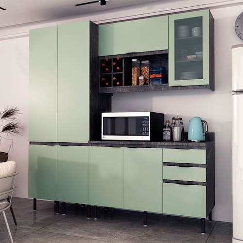 Itens Inclusos: (CZ1201) 01 Balcão de 120cm 01 Tampo de 120cm 01 Aéreo de 120cm com Porta de Vidro 02 Paneleiros