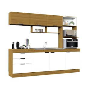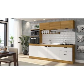 A Cozinha Compacta Primavera Bella é uma ótima opção para quem busca praticidade e beleza em um só produto. Ela possui 6 portas e 3 gavetas com corrediças telescópicas e dobradiças metálicas, que garantem maior durabilidade e facilidade de abertura e fechamento. Além disso, ela conta com um nicho exclusivo para forno elétrico e microondas, um porta-temperos e um perfil puxador em alumínio. O acabamento em freijó e branco brilho confere um toque de elegância e modernidade ao ambiente. Ean: 7899585710267