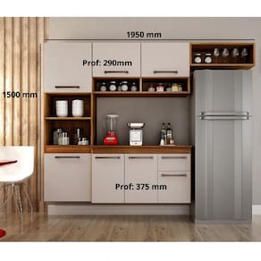As medidas totais da Cozinha Liz são: 1,95 m de largura, 1,5 m de altura e 29 cm de profundidade do armário e nicho e 37,5 de profundidade do balcão.
