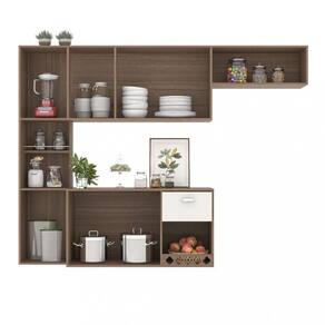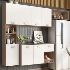 A Cozinha Suspensa com balcão Mila da Poliman Móveis é moderna e ideal para ambientes compactos. Modelo suspenso composto por paneleiro com nichos decorativos e detalhe da barra em polímero para dar mais segurança a objetos de vidro, aéreo com quatro portas de bater e nicho aberto que pode ser utilizado sobre fogão ou geladeira para aproveitamneto de espaço, além do balcão com tampo 2 portas 1 gaveta e nicho com aplique usinado a laser decorativo para acomodar frutas e legumes. Possui puxadores concha retrô em polímero, dobradiças reforçadas de 26mm e corrediças telescópicas permitindo abertura total, balcão com tampo. Estrutura em MDP Perffect Touch de maior resistência e com proteção Bacterban que inibe a proliferação de fungos e bactérias na superfície do móvel, acabamento das portas em pintura UV brilho e acetinada.