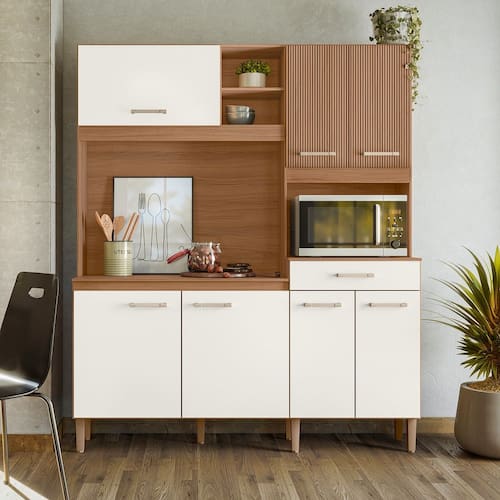 Características: Estrutura em MDP Acabamento de Pintura em UV 07 Portas, sendo 01 basculante Pistão a Gás 01 Gaveta com corrediças metálicas Espaço para forno elétrico ou microondas Prateleiras com amplo espaço Aplique decorativo ripado.