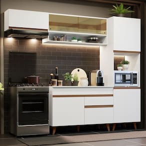 Para completar, os módulos são avulsos, o que permite a montagem conforme a necessidade do ambiente. Além disso, o balcão acompanha tampo, que pode ser removido para colocação de pia com espaço de 120 x 52 cm.