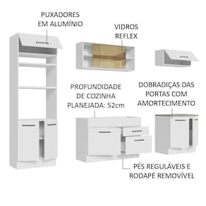 O acabamento da estrutura é branco e as portas e frentes são no padrão amadeirado Rustic. É feito em Pintura Poliéster com 7 camadas que protegem o móvel dos efeitos do álcool da água e do calor.