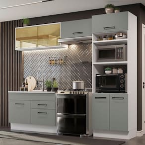 Totalmente modulada, todos os armários e balcões da cozinha podem ser organizadas conforme a necessidade do seu ambiente. Assim, se torna praticamente uma cozinha planejada para o seu espaço.