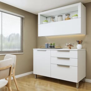É fácil de instalar? Sim, vem com as instruções necessárias para uma instalação simples e rápida. Acabamento da Prateleira: Pintura Escala de Brilho da Prateleira: Semi-Fosco Acabamento da Gaveta: Pintura Acabamento da Porta: Pintura Escala de Brilho da Porta: Semi-Fosco Acabamento: Pintura Acompanha Tampo: Sim Altura dos Pés: 14 cm Ambiente Principal: Cozinha Balcão Suporta Pia: Não codigo_ean: 7900288239167 Complexidade da Montagem: Baixa: pode ser montado por uma pessoa sozinha Cor: Branco Cor do Produto: Branco Escala de Brilho: Semi-Fosco Gaveta com Chave: Não Itens Inclusos: 1 Armário Aéreo; 1 Balcão; Kit Ferragens e Manual de Montagem Linha ou Coleção: Texas Manual de Montagem e Instalação: https://cdn2.madeiramadeira.com.br/atributo/minastex/3199011-5541-17576831767381.pdf Marca: Minastex Material da Corrediça: Metálica Material da Dobradiça/Corrediça da Porta: Metálica Material da Gaveta: MDP Material da Porta: MDP Material da Prateleira: MDP Material do Tampo: MDP Material dos Pés: PVC Medida de cada item (A x L x P): aéreo: 77,3x120x29,5 / Balcão: 94,7x120x49,7 modular: Sim Necessita Montagem: Sim O Balcão Acompanha Pia: Não Origem do Produto: Nacional Pés Reguláveis: Sim Peso: 78,5 kg Peso Máximo por Gaveta: 5 kg Peso Máximo por Prateleira: 10 kg Possui Pés: 05 Possui Portas: Sim Possui Prateleiras: Sim Possui recorte para Cooktop: Não Possui Rodízio: Não Possui Vidro: Não Recomendações de Uso, Manutenção e Limpeza: Limpar com flanela limpa e seca. Não usar produtos abrasivos. Sapatas Niveladoras: Não Sistema de Montagem: Parafusos e Cavilhas Tipo de Corrediça da Gaveta: Telescópica Tipo de Dobradiça da Porta: 35 mm Tipo de Porta: Misto (Bater e Basculante) Tipo de Puxador da Gaveta: Externo Tipo de Puxador da Porta: Externo Marca: Não Informado
