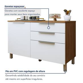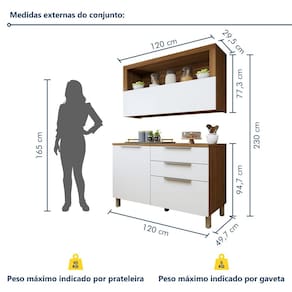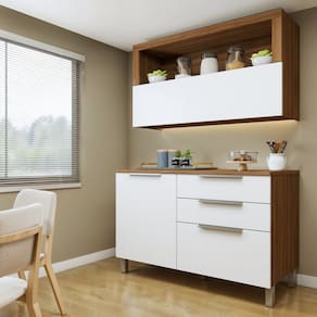 É fácil de instalar? Sim, vem com as instruções necessárias para uma instalação simples e rápida. Acabamento da Prateleira: Pintura Escala de Brilho da Prateleira: Semi-Fosco Acabamento da Gaveta: Pintura Acabamento da Porta: Pintura Escala de Brilho da Porta: Semi-Fosco Acompanha Tampo: Sim Altura dos Pés: 14 cm Altura Máxima dos Pés: 14.0000 Ambiente Principal: Cozinha Balcão Suporta Pia: Não codigo_ean: 7900288239150 Complexidade da Montagem: Baixa: pode ser montado por uma pessoa sozinha Cor: Carvalho/Branco Cor do Produto: Carvalho/Branco Escala de Brilho: Semi-Fosco Gaveta com Chave: Não Itens Inclusos: 1 Armário Aéreo; 1 Balcão; Kit Ferragens e Manual de Montagem Linha ou Coleção: Texas Manual de Montagem e Instalação: https://product-hub-prd.madeiramadeira.com.br/645446685/documents/3ed5a197-3269-415f-90b5-f26dbf36b3393199011554117576831767381.pdf Marca: Minastex Material da Corrediça: Metálica Material da Dobradiça/Corrediça da Porta: Metálica Material da Gaveta: MDP Material da Porta: MDP Material da Prateleira: MDP Material do Tampo: MDP Material dos Pés: PVC Medida de cada item (A x L x P): aéreo: 77,3x120x29,5 / Balcão: 94,7x120x49,7 modular: Sim Necessita Montagem: Sim O Balcão Acompanha Pia: Não Origem do Produto: Nacional Pés Reguláveis: Sim Peso: 78,5 kg Peso Máximo por Gaveta: 5 kg Peso Máximo por Prateleira: 10 kg Possui Pés: 05 Possui Portas: Sim Possui Prateleiras: Sim Possui recorte para Cooktop: Não Possui Rodízio: Não Possui Vidro: Não Produto Montado: Sim Recomendações de Uso, Manutenção e Limpeza: Limpar com flanela limpa e seca. Não usar produtos abrasivos. Sapatas Niveladoras: Não Sistema de Montagem: Parafusos e Cavilhas Tipo de Corrediça da Gaveta: Metálica Telescópica Tipo de Dobradiça da Porta: 35 mm Tipo de Dobradiça/Corrediça da Porta: 35 mm Tipo de Puxador da Gaveta: Externo Tipo de Puxador da Porta: Externo Marca: Não Informado