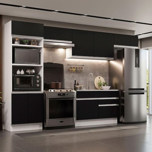 Super espaçosa, a cozinha é composta por diversos módulos avulsos, que podem ser dispostos conforme a necessidade do seu ambiente. Assim, se torna praticamente uma cozinha planejada para seu espaço.