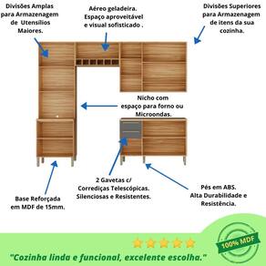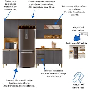 A Cozinha Napoli Prime é um produto 100% MDF, o seu acabamento é em pintura U.V. e fita de bordo FF. Possui 4 peças, Aéreo Geladeira Com Adega, Aéreo Triplo, Balcão com Tampo e Paneleiro Com nicho pra micro-ondas. Conta com 11 portas e 2 Gavetas com corrediças telescópicas e Pés em ABS com 17 cm altura e com Regulagem.