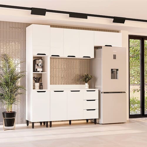 A cozinha 4 peças Meena da Politorno Móveis é perfeita para quem busca funcionalidade e elegância. Com 224,5 cm de altura, 240 cm de largura e 52 cm de profundidade, ela conta com 1 balcão com 3 gavetas e 2 portas, 3 armários aéreos, 1 armário aéreo basculante e 1 paneleiro com nichos, oferecendo amplo espaço para organizar utensílios, eletrodomésticos e mantimentos. Seu design sofisticado, combinado com materiais de alta qualidade, proporciona um ambiente moderno e prático. As corrediças telescópicas garantem deslizamento suave das gavetas, enquanto o acabamento em pintura UV assegura durabilidade. A cozinha Meena já vem com tampo, proporcionando uma solução completa e prática para sua cozinha.