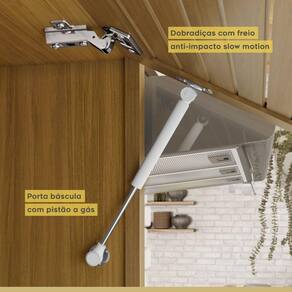 O armário aéreo de 2,00, foi projeto com uma porta articulada ripada, que traz aconchego, grande beleza e harmonia ao conjunto. Este mesmo armário possui montagem, podendo o armário de geladeira/depurador ser posicionado a direita ou a esquerda naira montagem.
