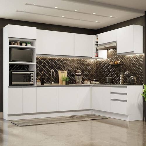 Totalmente modulada, permite organizar os armários e balcões conforme preferir no seu ambiente. Além disso, o canto pode ser montado tanto para o lado esquerdo quanto para o direito.