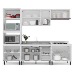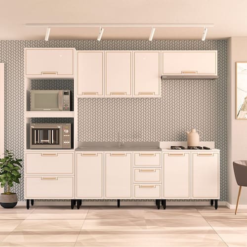 Modular : Não Peso (kg) : 145.36 Garantia : 06 Meses Altura (cm) : 224.5 Acabamento : Pintura UV Largura (cm) : 270 Possui Pés : 13 Possui Vidro : Não Possui Portas : Sim Tipo de Porta : Misto (Bater e Basculante) Altura dos Pés : 15 Pés Reguláveis : Sim Possui Gavetas : Sim Possui Rodízio : Não Suporta Até (kg) : 30 Acompanha Tampo : Não Profundidade (cm) : 52 Escala de Brilho : Semi-Fosco Gaveta com Chave : Não Material dos Pés : Plástico Serviço Montagem : 114259443 Material da Porta : MDF/MDP Origem do Produto : Nacional Acabamento dos Pés : Pintura Ambiente Principal : Cozinha Balcão Suporta Pia : Sim Material da Gaveta : MDF/MDP Material Principal : MDF/MDP Possui Prateleiras : Sim Acabamento da Porta : Finish Foil Quantidade de Peças : 5 Sapatas Niveladoras : Sim Acabamento da Gaveta : Finish Foil Balcão Acompanha Pia : Não Material da Prateleira : MDF/MDP Peso Máximo por Gaveta : 5 Acabamento da Prateleira : Finish Foil Tipo de Puxador da Porta : Externo Escala de Brilho da Porta : Semi-Fosco Tipo de Puxador da Gaveta : Externo Escala de Brilho da Gaveta : Semi-Fosco Peso Máximo por Prateleira : 3 Tipo de Armário de Cozinha : Cozinha Completa Possui Recorte para Cooktop : Não Tipo de Corrediça da Gaveta : Metálica Telescópica Material do Puxador da Porta : Alumínio Material do Puxador da Gaveta : Alumínio Escala de Brilho da Prateleira : Semi-Fosco Medida de Cada Item (A x L x P) (novo) : Balcão: 81x120x50,5; Aéreo 66x120x30,5; Basculante 36x80x30,5; Torre Quente 224,5x70x52; Balcão 92,5x80x52 Material da Dobradiça/Corrediça da Porta : Alumínio Marca : Politorno Cor Interna : Branco Cor : Branco Cor do Produto : Branco Itens Inclusos : 1 Cozinha, Kit Ferragens e Manual de Montagem Cor Predominante : Branco Linha ou Coleção : Amara Quantidade de Prateleiras : 04 Prateleiras Quantidade de Portas : 10 Portas Quantidade de Gavetas : 04 Gavetas Quantidade do Produto : 5 Tamanho Indicado do Tampo (L x P) : 120x52