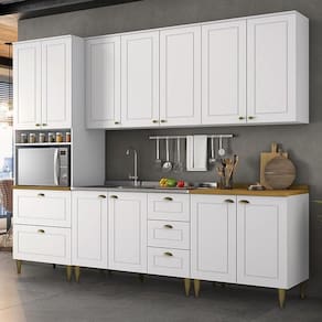 Com design contemporâneo, a Cozinha Americana embeleza qualquer ambiente. Seu conceito é inspirado nas clássicas cozinhas estilo americano, oferecendo uma decoração moderna e minimalista. Ela conta com puxadores em metal zamac, dobradiças 35 mm com amortecimento e espaçosos aéreos com 83cm de altura, proporcionando praticidade e funcionalidade. É um armário de cozinha 100% MDF com mais de 15 módulos, que possibilitam criar o projeto de cozinha dos seus sonhos.