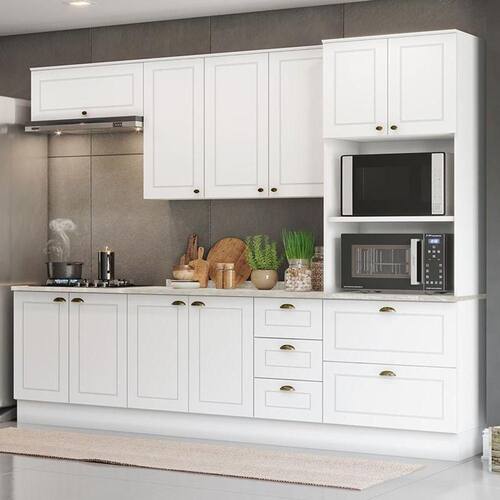 Com design contemporâneo, a Cozinha Americana embeleza qualquer ambiente. Seu conceito é inspirado nas clássicas cozinhas estilo americano, oferecendo uma decoração moderna e minimalista. Ela conta com puxadores em metal zamac, dobradiças 35 mm com amortecimento e espaçosos aéreos com 83cm de altura, proporcionando praticidade e funcionalidade. É um armário de cozinha 100% MDF com mais de 15 módulos, que possibilitam criar o projeto de cozinha dos seus sonhos.