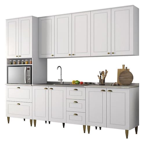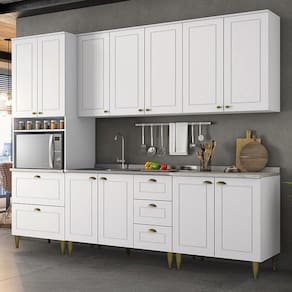 Com design contemporâneo, a Cozinha Americana embeleza qualquer ambiente. Seu conceito é inspirado nas clássicas cozinhas estilo americano, oferecendo uma decoração moderna e minimalista. Ela conta com puxadores em metal zamac, dobradiças 35 mm com amortecimento e espaçosos aéreos com 83cm de altura, proporcionando praticidade e funcionalidade. É um armário de cozinha 100% MDF com mais de 15 módulos, que possibilitam criar o projeto de cozinha dos seus sonhos.