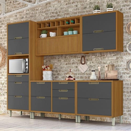 A Cozinha Completa 5 Peças Imperatriz Nesher 100% MDF tem design contemporâneo, robusto e é muito pratica. Inspirada em cozinhas planejadas, está disponível em módulos, permitindo composições variadas, projetos exclusivos, conforme o espaço e o gosto do consumidor. O armário aéreo de 120cm, foi projeto com uma porta articulada ripada, que traz aconchego, grande beleza e harmonia ao conjunto. Disponível em duas cores de porta, off-white e grafite, como o corpo sempre amadeirado freijó. Projetada para proporcionar praticidade e funcionalidade no uso diário, produzida com matérias prima de alto nível e ferragens tecnológicas de última geração. Todo o projeto foi pensado para embelezar sua cozinha com muita praticidade no uso e muita qualidade e durabilidade no dia a dia. Acabamento da Prateleira: Impressão Escala de Brilho da Prateleira: Semi-Brilho Acabamento da Gaveta: Impressão Escala de Brilho da Gaveta: Semi-Brilho Material do Puxador da Gaveta: Alumínio Acabamento da Porta: Impressão Escala de Brilho da Porta: Semi-Brilho Material do Puxador da Porta: Alumínio Acabamento dos Pés: Pintura Acompanha Tampo: Sim Altura dos Pés: 16 cm Altura Máxima dos Pés: 16.0000 Ambiente Principal: Cozinha codigo_ean: 7908506240735 Complexidade da Montagem: Média: pode ser montado por mais de uma pessoa e/ou necessite de maior conhecimento para montagem Cor: Freijó/Grafite Cor do Produto: Freijó/Grafite Cor Flex: Não Cor Interna: Freijó Escala de Brilho: Semi-Brilho Gaveta com Chave: Não Informações Complementares: Modernas portas com abertura basculante e pistão a gás. - Puxadores em perfil de Alumínio na cor bronze, moderno, com qualidade e durabilidade. - Corrediça Telescópica Abertura Integral: Robusta e com três estágios, esta corrediça é ideal para o uso diári Itens Inclusos: 1 Paneleiro, 2 Armários Aéreos, 2 Balcões e Manual de Montagem. Linha ou Coleção: Imperatriz - Nesher Manual de Montagem e Instalação: https://product-hub-prd.madeiramadeira.com.br/653478/documents/49903d77-0e56-4dc3-8c7f-503fe73248f5073103cozinha5pcspaneleiro.zip Material da Dobradiça/Corrediça da Porta: Metálica Material da Gaveta: MDF Material da Porta: MDF Material da Prateleira: MDF Material do Fundo: Chapa de Fibra Material do Tampo: MDF Material dos Pés: Polipropileno Medida de cada item (A x L x P): Aéreo: 78cm x 80cm x 32cm; Aéreo Adega: 78cm x 120cm x 32cm; Paneleiro: 221cm x 70cm x 52cm; Balcão 1 Gaveta 1 Porta: 86cm x 80cm x 52cm; Balcão 2 Porta, 4 Gavetas: 86cm x 120cm x 52cm Medida do Recorte para Cooktop: 62cm x 35cm Montagem Flex: Não Necessita Montagem: Sim O Balcão Acompanha Pia: Não Origem do Produto: Nacional Pés Reguláveis: Sim Peso: 215,5 kg Peso Máximo por Gaveta: 5 kg Peso Máximo por Prateleira: 15 kg Possui Pés: 13 Possui Portas: Sim Possui Prateleiras: Sim Possui recorte para Cooktop: Não Possui Rodízio: Não Produto Montado: Sim Recomendações de Uso, Manutenção e Limpeza: Utilizar pano macio levemente umedecido e na sequencia pano macio seco. Sapatas Niveladoras: Sim Sistema de Montagem: Parafusos, Cavilhas e Minifix Suporta Até (kg): 130 kg Tamanho Indicado da Pia: 120 x 53cm Tipo de Corrediça da Gaveta: Metálica Telescópica Tipo de Dobradiça da Porta: Metálica Tipo de Dobradiça/Corrediça da Porta: Metálica Tipo de Puxador da Gaveta: Externo Tipo de Puxador da Porta: Externo