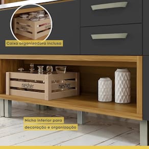 A cozinha Nesher Princesa possui um design contemporâneo, robusto e prático, com opções modulares que permitem composições personalizadas. Seu armário aéreo de 2,00 metros conta com uma porta articulada ripada e montagem flexível, oferecendo versatilidade. O balcão inclui um nicho com uma caixa organizadora, ideal para armazenar utensílios e frutas. A cozinha é projetada para funcionalidade e durabilidade. Destaca-se pelas ferragens de última geração, puxadores modernos em ABS gold, corrediças telescópicas e gavetões ergonômicos. Além disso, oferece um paneleiro com nicho para micro-ondas.