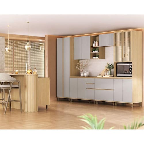 Cozinha Completa 6 Pçs Espaço Micro-ondas E Tampo 340cm Carvalho/cinza Cristal Desenvolvidas para quem busca qualidade, estilo e um toque de charme, as Cozinhas Aura sao perfeitas! Estruturas em 100 MDF que oferece maior resistencia e durabilidade ao movel. Possui estilo moderno, garantindo conforto e aconchego para sua Cozinha. Caracteristicas: Estrutura: MDF 15mm e 18mm Tampos: 25mm Acabamento Pintura UV e Pintura PET Quantidade de Portas: 17 Tipo de Abertura das Portas: de Abrir/Bater Tipo de Dobradicas: Metalica Slowmotion 35mm Quantidade de Gavetas: 5 Quantidade de Prateleiras: 15 Tipo de Corredicas: Telescopicas Tipo de Puxador: Cava em MDF e Externo em Aluminio Tipo de Pes: Plastico com regulagem de altura Sistema de Montagem: Cavilhas, Parafusos e Minifix Garantia: 3 meses