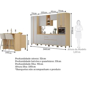 Ambiente composto por: (A x L x P) 1 Paneleiro 2 Portas 70cm com Espaco para Micro-ondas Aura Luciane Moveis (230 x 70 x 53) 1 Armario Aereo 120cm 2 Portas com Nicho Aura Luciane Moveis (80 x 120 x 32) 1 Armario Aereo para Geladeira 80cm 2 Portas Aura Luciane Moveis (40 x 80 x 32) 2 Balcoes de Cozinha para Pia 120cm 3 Portas e 2 Gavetas Com Tampo Aura Luciane Moveis (90 x 120 x 53) cada 1 Balcao de Cozinha 80cm 1 Porta 1 Gav com Tampo Aura Luciane Moveis (90 x 80 x 53) 1 Paneleiro 70cm 4 Portas com Espaco para Micro-ondas Aura Luciane Moveis (230 x 70 x 53) 1 Bancada de Cozinha 144cm com Tampo Para Ilha Canto Arredondado Aura Luciane Moveis (100 x 144 x 40)
