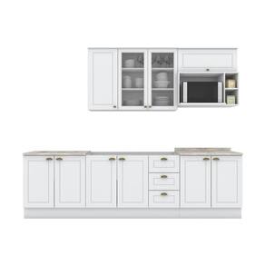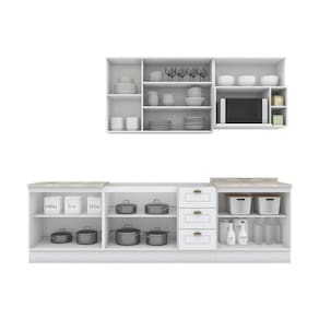 Itens Inclusos: 1 Balcão 2 Portas 3 Gavetas, 1 Aéreo 1 Porta Basculante, 1 Balcão 2 Portas, 1 Balcão 2 Portas, 1 Aéreo, 1 Aéreo Microondas, Kit Ferragens e Manual de Montagem