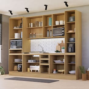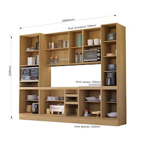 Informações Complementares: Tampo em MDP 25mm BP com rodatampo de 8 cm. Prateleiras suportam até 5kg, bases 10kg. Distribua uniformemente os objetos. Podem ser montados com pés ou rodapés, ambos acompanham os produtos. As dimensões máximas dos eletrodomésticos devem respeitar a margem de respiro com folga de 5cm das laterais do móvel.