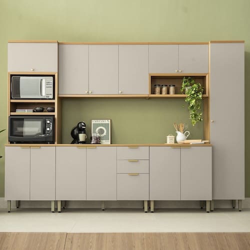 A Cozinha Selene, composta por 6 módulos, é a escolha ideal para quem busca aliar modernidade e funcionalidade no ambiente. Fabricada 100% em MDF, garante resistência e um acabamento de alto padrão. Possui dobradiças com amortecimento e elegantes puxadores dourados de sobrepor, que conferem sofisticação ao design. O conjunto inclui uma torre com nichos, armário aéreo de 0,8m com nicho emoldurado, e um paneleiro, oferecendo mais praticidade e espaço para organização. Perfeita para transformar sua cozinha em um espaço bonito, funcional e bem estruturado.