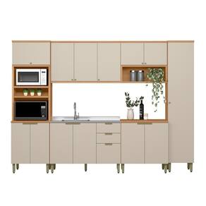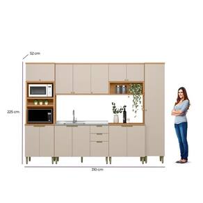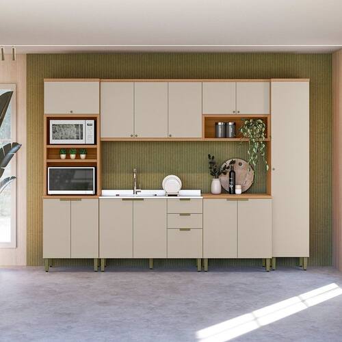 A Cozinha Selene, formada por 6 módulos, oferece a combinação ideal entre estilo contemporâneo e praticidade. Produzida 100% em MDF, assegura alta durabilidade e acabamento de excelente qualidade. Equipada com dobradiças com amortecimento e puxadores dourados de sobrepor, adiciona um toque de elegância ao ambiente. O conjunto conta com uma torre com nichos e armário aéreo de 0.8m com nicho emoldurado, um paneleiro, e balcão de 1,20m sem tampo para ser utilizado com pia que traz um visual moderno e sofisticado. Uma opção perfeita para quem deseja uma cozinha funcional, organizada e cheia de charme.