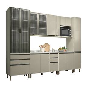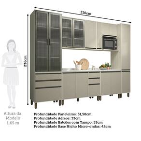 Ambiente composto por: -A x L x P- - 1 Paneleiro 70 cm 2 Portas 3 Gavetas com Vidro Canelado -236 x 70 x 51,5- - 1 Armário Aéreo 3 Portas com Vidro Canelado -85 x 120 x 33- - 1 Armário Aéreo 20 cm 1 Porta -85 x 20 x 33- - 1 Armário Aéreo 60 cm com nicho para micro-ondas 2 Portas -85 x 60 x 42- - 1 Balcão de Pia sem Tampo para Cozinha 120cm 2 Portas de Abrir, 3 Gavetas -87 x 120 x 51,5- - 1 Balcão de Cozinha com Tampo 80 cm 2 Portas de Abrir 1 Prateleira -89,5 x 80 x 53- - 1 Paneleiro de Cozinha 40 cm 2 Portas 4 Prateleiras -236 x 40 x 51,5- - 1 Tampo para Balcão 120cm MDP -2,5 x 120 x 53-