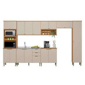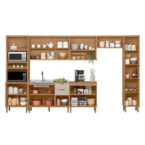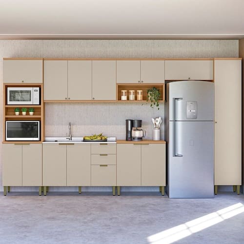A Cozinha Selene, formada por 7 módulos, é a opção perfeita para quem deseja unir funcionalidade e um visual moderno no mesmo ambiente. Produzida 100% em MDF, oferece alta durabilidade e um acabamento refinado. Conta com dobradiças com amortecimento e sofisticados puxadores dourados de sobrepor, que adicionam um toque de elegância ao design. O conjunto inclui uma torre com nichos, armário aéreo de 0,8m com nicho emoldurado, um paneleiro que proporciona mais espaço e praticidade, além de um balcão de 1,20m sem tampo, ideal para instalação de pia. Uma excelente escolha para deixar sua cozinha mais organizada, estilosa e eficiente.