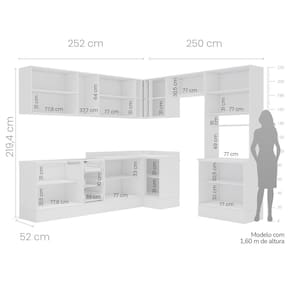 Medida de cada item (A x L x P): Balcão (84cm x 120cm x 50,5cm); Aéreo 3 Portas (67cm x 120cm c 36,5 cm); Basculante ( 33,5cm x 80cm x 36,5cm); Aéreo Canto (67cm x 90+52cm x 35cm); Balcão Canto ( 94cm x 90+52cm x 52cm) ; Aéreo 2 Portas (67cm x 80cm x 36,5cm); Balcão 2 Portas (93,7cm x 80cm x 52 cm) ; Torre quente (219,4 cm x 80cm x 52cm)