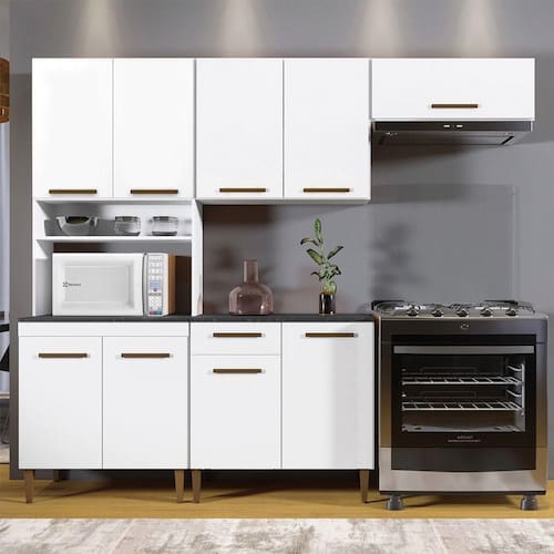 Na hora de mobiliar o seu comodo de chef voce nao precisa comprometer a decoracao para ter um movel funcional e que acomode todos aqueles itens essenciais. A Cozinha Atenas nao so esta preparada para deixar o comodo com um visual incrivel, mas tambem vai ser a aliada perfeita para armazenar loucas, utensilios, alimentos e eletrodomesticos de forma funcional. Ja por fora, a peca tem acabamento charmoso com puxadores discretos que ajuda a trazer um toque especial ao ambiente, enquanto as cores versateis agregam muito a estetica dessa peca primorosa. Muito bom gosto para o seu lar-style!